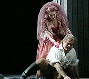 Was die Musik verspricht, löst das szenische Spiel ein: Während Susanna mit dem Brautkranz spielt kriecht, wie so oft, Figaro über den Fußboden und misst das künftige Schlafgemach aus. Wer hier schneller schaltet und waltet, stellt sich gleich heraus, denn Heike Wittlieb ist eine quicklebendige Komödiantin mit einem hellen, sicher und flexibel geführten Sopran und rascher Verstellungskunst. Trond Gudevold wirkt dagegen begriffsstutzig, ausgestattet mit einem stabilen, aber nicht sonderlich kernigen Bass. Seine Aufmüpfigkeit hält sich in Grenzen, schön zornig ballt er in seiner Kavatine gegen den Graf die Fäuste, schlägt dann mit der Elle gegen die Wäsche los und bleibt dabei doch ein kreuzbraver Bursch. Nicht er wird das Spiel um die Mannesehre und die Reinheit der Braut gewinnen, sondern der List der Frauen wird es zu danken sein, wie wir am Ende erfahren.