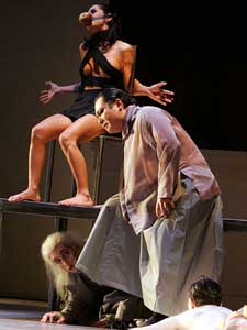 Georg Köhl schießt – wie schon mancher Regisseur vor ihm – in einem Punkt über das Ziel hinaus: Aus Scarpia will er unbedingt die Inkarnation des Bösen schlechthin machen. Dabei bringt der Bassbariton Jooil Choi alles, was dazu nötig wäre, schon in der Stimme mit: Übel lüstern funkelt es da, schwarz blecken die Abgründe, donnernd krachen die Kanonen. Aber Köhl will hier plakativ sein, stilisiert ihn zum päpstlichen Guru hoch, der mit rotberockten Kardinälen eine schwarze Messe feiert oder mittels seiner fiesen Entourage (Steffen Doberauer als Spoletta mit Chan Il Seok und Shuichi Umino) halbentkleidete Frauen als Lustobjekte knechtet. Je mehr sich die Regie in diese Gewaltfantasien hineinsteigert, umso ungereimter wird die Sache. Die Live-Schaltung per Gegensprechanlage in die Folterkammer etwa bricht unglücklich mit der irgendwo im 19. Jahrhundert angesiedelten, aber deshalb nicht zwangsläufig gestrigen Aura, um die sich Regie und die Kostümbildnerin Gabriele Jaenecke sonst erfolgreich bemüht hatten. Und wie Willy Decker in Stuttgart soll sich unbedingt auch ein merkwürdiges Abhängigkeitsverhältnis zwischen Tosca und Scarpia andeuten. Schon im ersten Akt lehnt sie sich in ihrer Eifersuchtsverzweiflung ausgerechnet bei ihm an und wird ihm, dem Erotikon des Negativen, einen Kuss (“il bacio di Tosca”) auf die erkaltenden Lippen drücken, nachdem sie ihm das Messer tödlich in den Unterleib gerammt hat. Eigentlich hätte der Engel da sein weises Haupt schütteln müssen. Ansonsten aber hat er viel Puccini-Glück an die Förde gebracht.