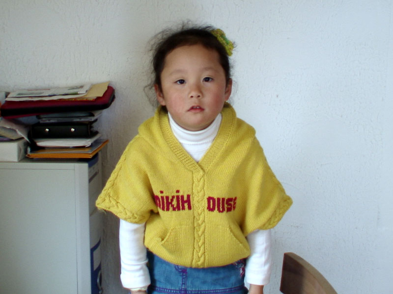 할머니께서 손수 짜주신 조끼를 입고 좋아하는 샤론