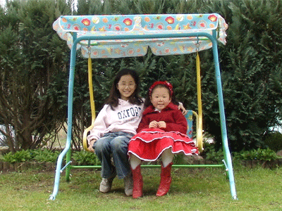 우리집 앞마당에서 샤론이와 의진이가 함께 그네에 앉아서 한 컷~, 아니 두 컷~
