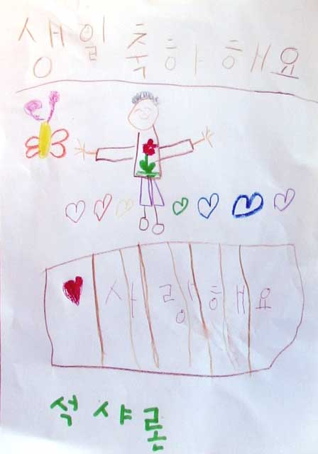 아빠 옷에 꽃도 그려주고, 옆에는 예쁜 나비를, 아래에는 일곱가지 무지개 하트를 그려서 아빠를 향한 샤론이의 사랑을 표현했다