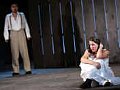 Ausgesprochen “tschechisch” wird es, wenn Koegel-Dorfs den Bühnenrealismus ins Groteske kippen lässt und Bühnenbildner Andreas Auerbach dafür seine Jenufa-Bretterscheune perspektivisch verzerrt weitet. Da gerät dann der anrührend verträumt gezeigte Außenseiter Wenzel in den Bann einer skurrilen, aber für ihn besseren Parallelwelt: die Welt des schönen Theaterscheins, in der gestelzt komödiantische Direktoren (mit fast dämonischer Präsenz: Martin Fleitmann) und vielfältig lockende Traumtänzerinnen (Michaela Rams) die Erdenschwere aufheben. Steffen Doberauer, im allerbesten Sinne ein Spieltenor, möchte man da gerne die Krone des Abends überreichen, denn er singt die (gefürchteten!) Stotter-Arien des Wenzel perfekt und enorm ausdrucksstark. Durch ihn lassen Schwejk und Broucek grüßen. Und man wäre nicht verwundert, wenn er sich auf offener Bühne vom Bären auch noch in einen Kafka-Käfer verwandeln würde.