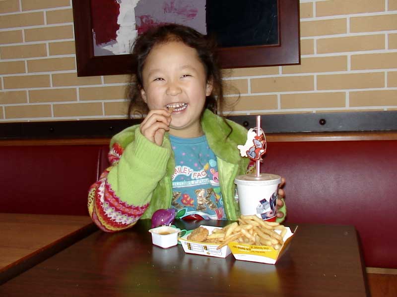 샤론이는 해피 밀 메뉴 중 햄버거 대신 닭고기 너겟을, 콜라 대신 오렌지 쥬스를 시켜서 비교적 건강에 덜 해로운 것으로 먹는다.