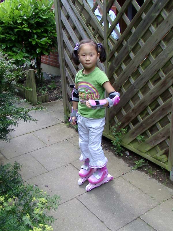 샤론이가 생일선물로 받은 인라인 스케이트를 타고서 좋아하고 있다.