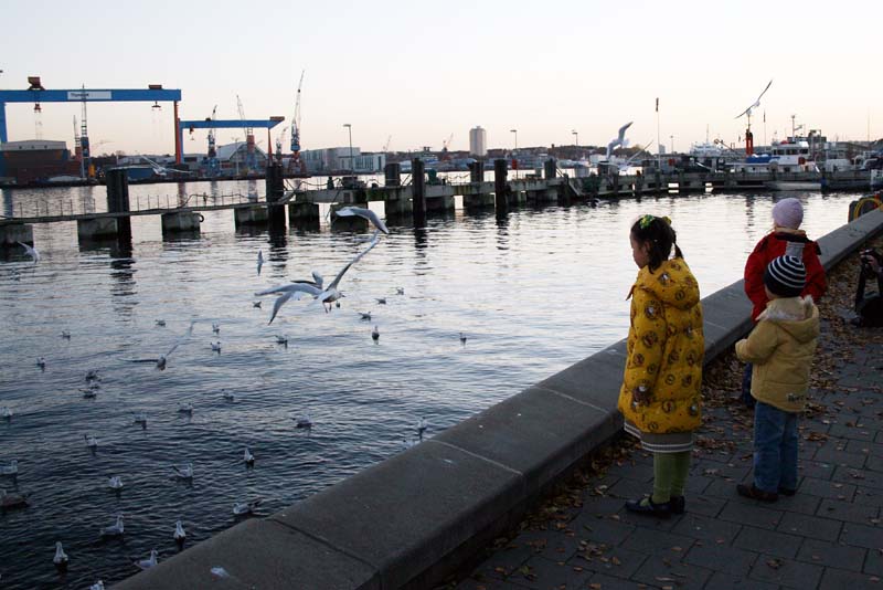 바닷가의 갈매기를 구경하는 아이들, 그리고 사람들