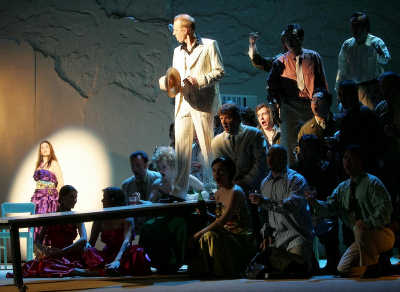 Auftritt des Toreros Escamillo (Jörg Sabrowski), bejubelt von den Gästen in Lillas Pastias Schänke und lauernd beobachtet von Carmen (Marina Fideli, links). Foto Olaf Struck