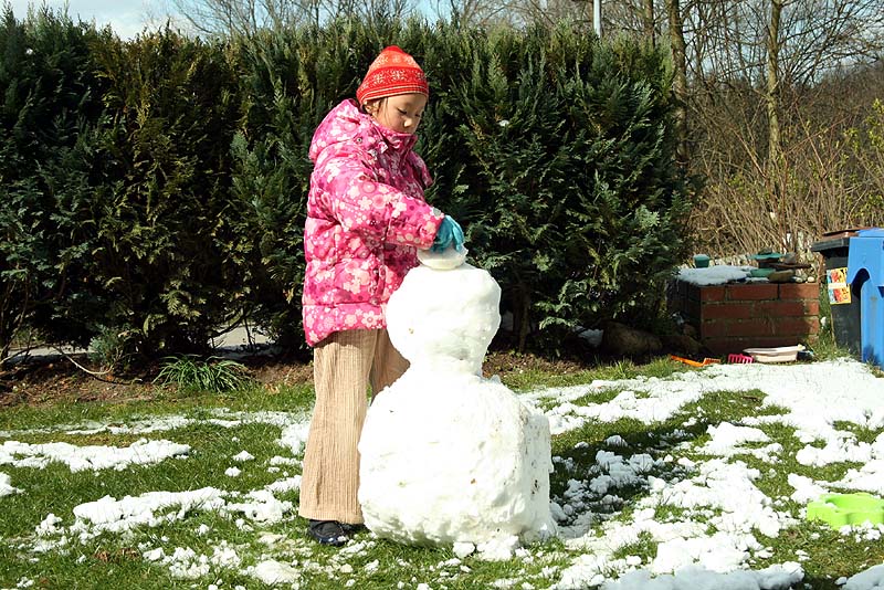 지난 밤에 내려서 조금 쌓였던 눈을 모아서 샤론이가 눈사람을 만들었습니다.