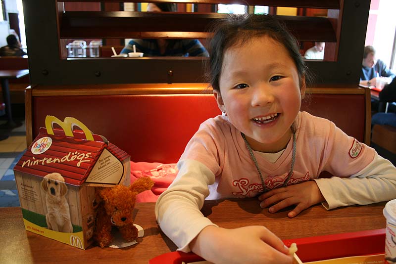 첫번째 사진은 맥도날드에서 해피 밀(Happy Meal)을 시켜서 선물로 나온 강아지와 함께 즐거워하고 있는 샤로니의 모습입니다.