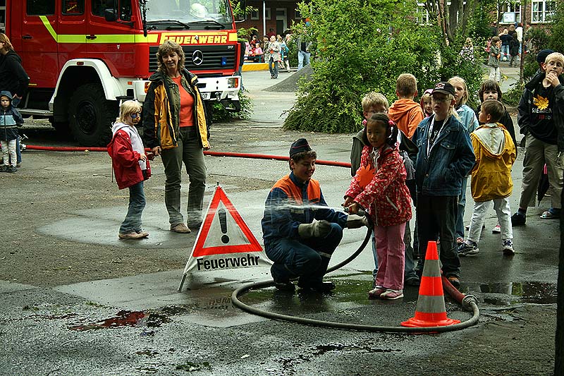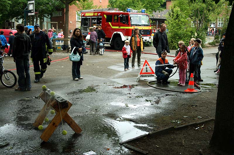 소방서에서 소방대원들이 나와서 아이들이 직접 소방호스로 잘 정렬해 놓은 테니스 공을 떨어뜨리는 놀이를 할 수 있게 해 주었다.
