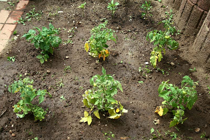 토마토 모종은 좀 시들한 것을 막 심어서 그런지 누렇게 뜬 잎사귀가 좀 보인다.