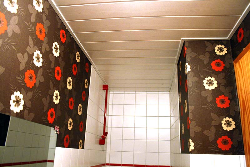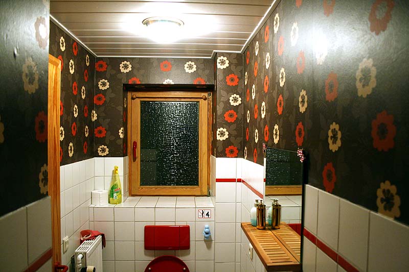 사진에 보이는 것처럼 화장실 벽에 둘려있는 붉은 띠와 어울리는 붉은 색 꽃무늬 벽지이다.