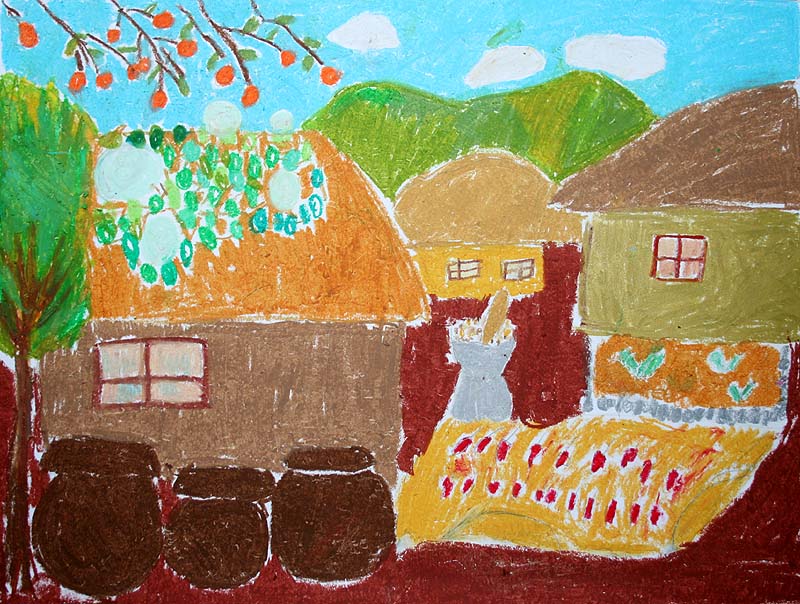 그 달력에 있는 사진 중 한국적인 그림이라며 샤론이가 좋아하던 사진이 있는데, 그 사진을 샤론이가 도화지에 크레파스로 그렸다.