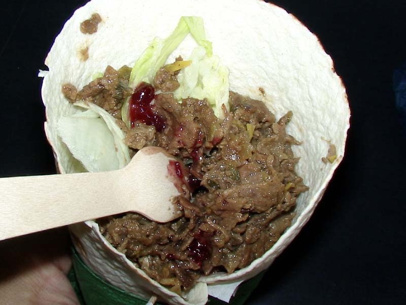 사슴고기 조금에 샐러드 몇 조각, 그리고 약간 달콤한 소스를 곁들인 이 음식의 가격은 6유로.