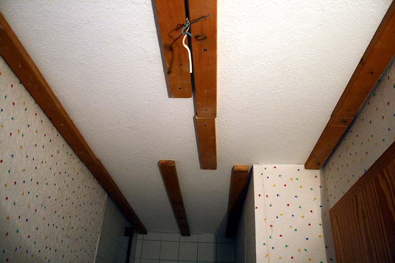 그 중 오른편의 전등은 스위치가 두개로 나뉘어져 있는 전선배치로 되어 있어서, 이번에 천장 공사를 하면서 그 중 하나의 선을 왼편 아랫쪽의 전등이 달린 곳까지 연결하여 새로이 배치한 것이다.