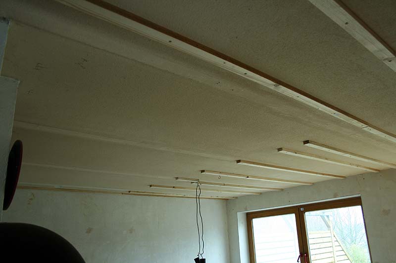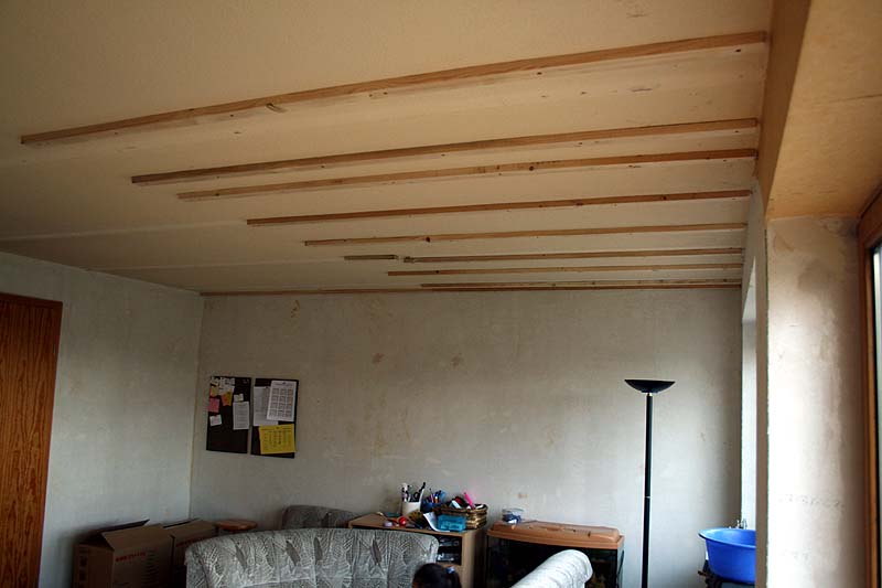 벽지를 뜯어내고 천장에 판넬을 대기 위하여 기초작업을 하고 있다.