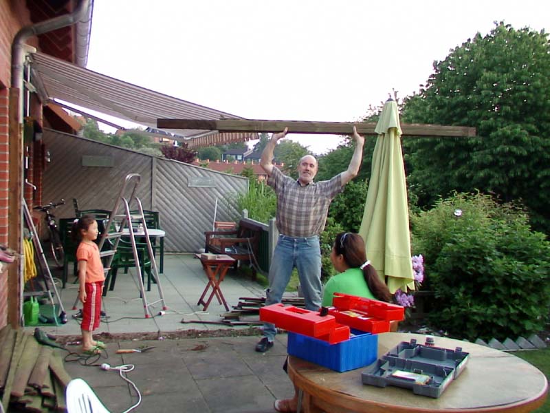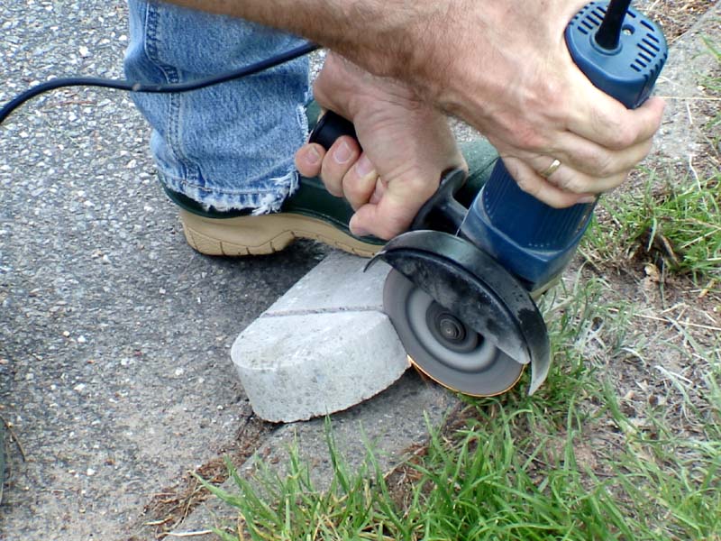 폴커(Volker)는 담장 아래에 둘 돌을 자른다.