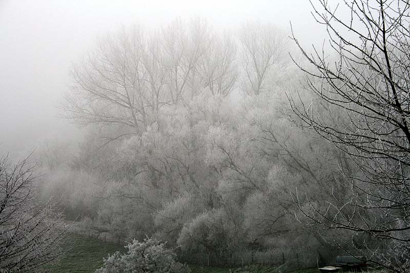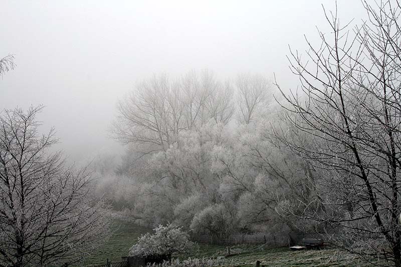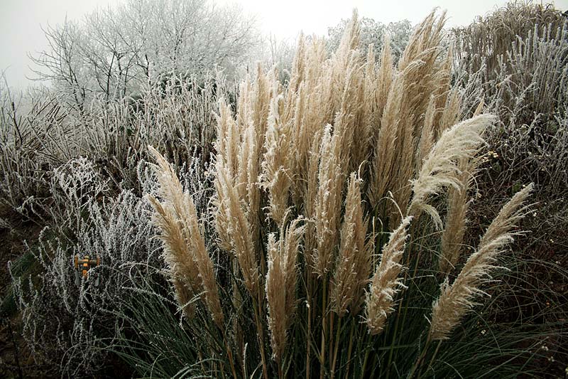 우리집 마당에 있는 갈대와 풀 위에 핀 눈꽃